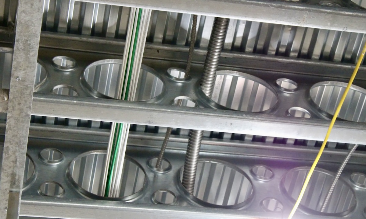 Here, MEP runs just below the punch outs in the cold-formed steel (CFS) floor joists.